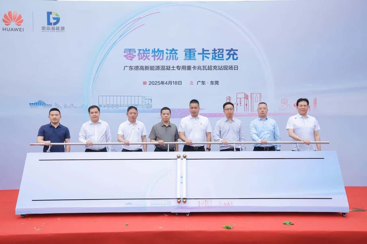 活動(dòng)現(xiàn)場(chǎng),氣氛熱烈非凡。東莞市德高新能源有限公司院內(nèi),整齊排列的解放底盤新能源充換電一體攪拌車,宛如整裝待發(fā)的鋼鐵軍團(tuán),氣勢(shì)恢宏。而一旁的華為數(shù)字能源重卡兆瓦超充站,散發(fā)著科技的魅力,與攪拌車相互輝映,勾勒出一幅智慧與力量交融的壯麗圖景。